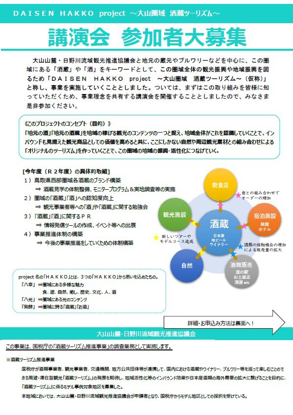 大山山麓・日野川流域観光推進協議会と 地元の蔵元 や ブルワリー などを中心に、この圏域に ある 「酒蔵 」 や「酒」 を キーワードとして、 この圏域全体の 観光振興 や 地域振興を図るため 「DAISEN HAKKO project ~大山圏域 酒蔵ツーリズム~ ~(仮称 」と称し、事業を実施していくこととしました 。